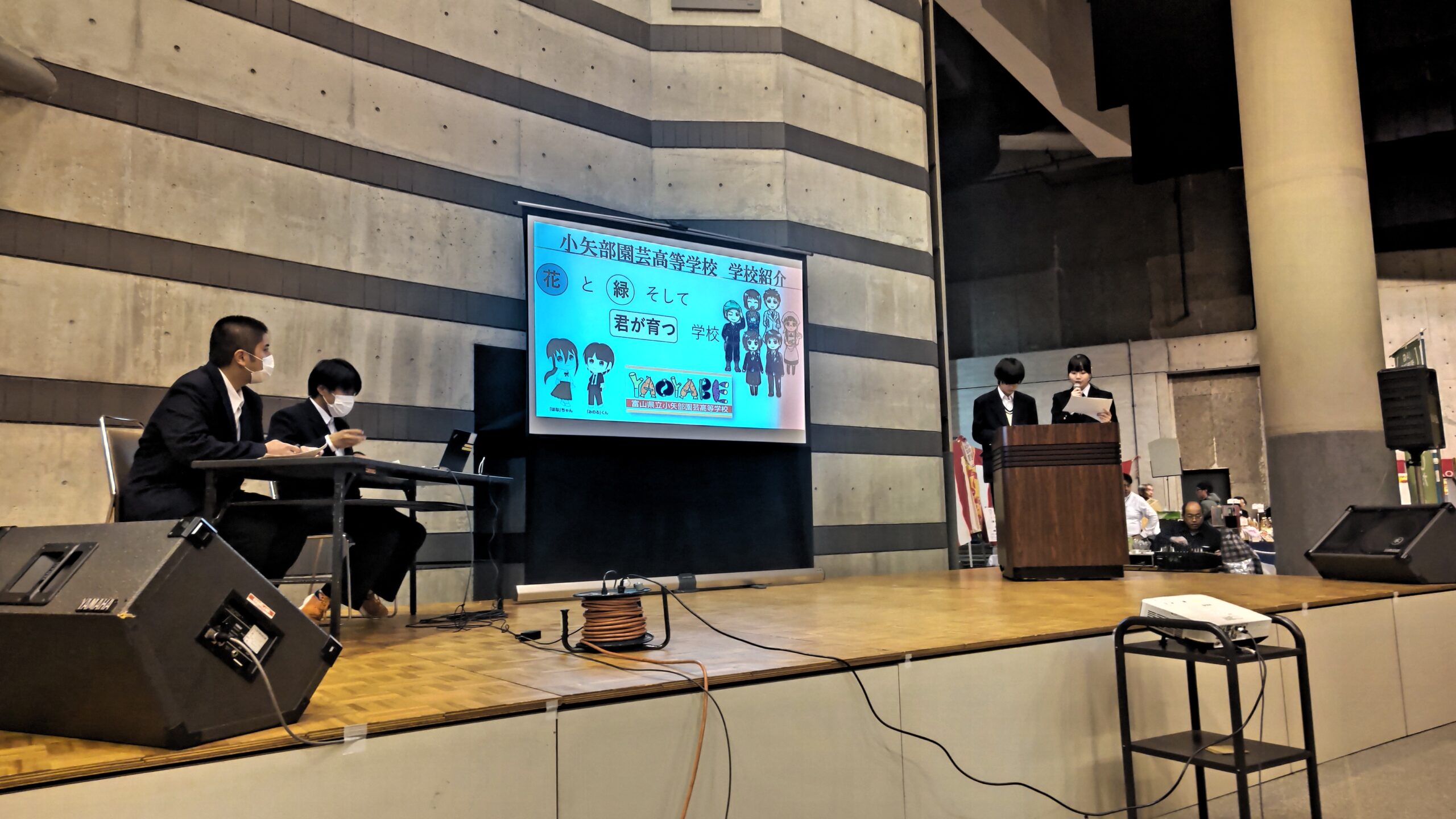 11月8~9日にクロスランドおやべで開催された「小矢部市農業祭」のステージ発表において、造園系列3年生4名が学校紹介と共に研究発表を行いました。