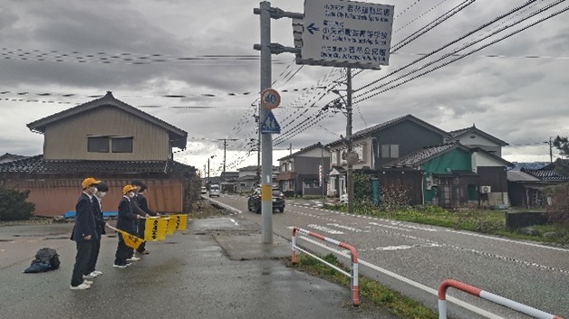 さらに10日には、交通安全委員が学校近くの交差点で小雨の中、通学する新入生を迎えながら声かけをおこないました。
